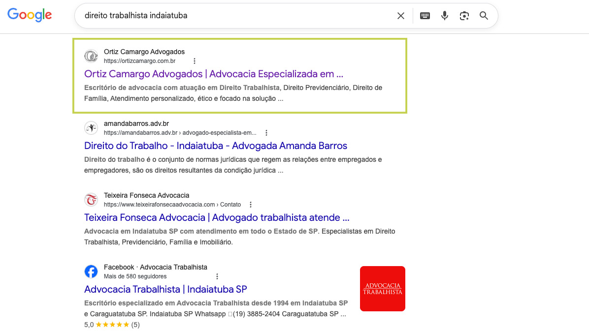 • Serviços Jurídicos (Ortiz Camargo): O mercado jurídico é um dos mais competitivos no Google. Através de uma estratégia de conteúdo técnico e autoridade local, o escritório Ortiz Camargo Advogados conquistou a primeira página, posicionando-se como referência para quem busca advocacia especializada na cidade.